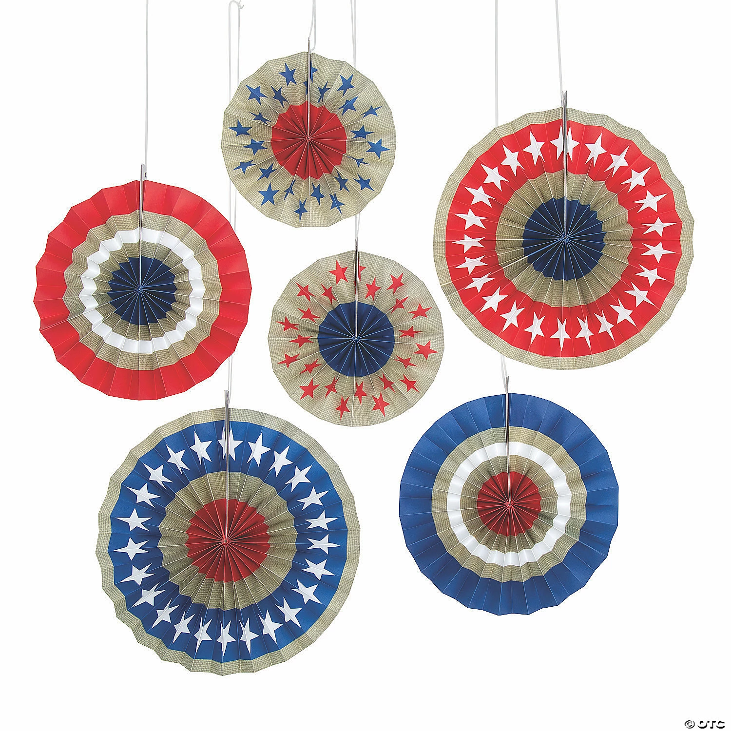 โข PERFECT FOR ANY EVENT: From Independence Day parties to Veteran’s Day events, these hanging fans make the perfect party decorations. Theyโre versatile and fun!โข VIBRANT COLORS: Choose the hanging fan color that best matches your celebrationโs theme for pops of color that will impress guests.โข CREATIVE USES: Hanging fans are great as party decorations, and also work for art projects inside and outside the classroom, or as interesting additions to home dรฉcor projects. โข BUDGET-FRIENDLY DECORATIONS: You wonโt find these patriotic hanging fans at this low price anywhere else! Why spend more on party decorations when you donโt have to?Product Description:This lovely assortment of paper fans will add depth and variety to your patriotic decorations. Suitable for Fourth of July parties, Veteran’s Day celebrations, and gatherings to welcome home your local heroes, these fans feature patriotic colors and designs. The muted burlap look of the fans add some class and sophistication. Add these hanging decorations to your patriotic party for a look that will impress! Size: Includes 2 each 8โ, 10″ and 12โ diam.Shape: RoundQuantity: 6Material: CardstockSimple assembly required.ยฉ OTC