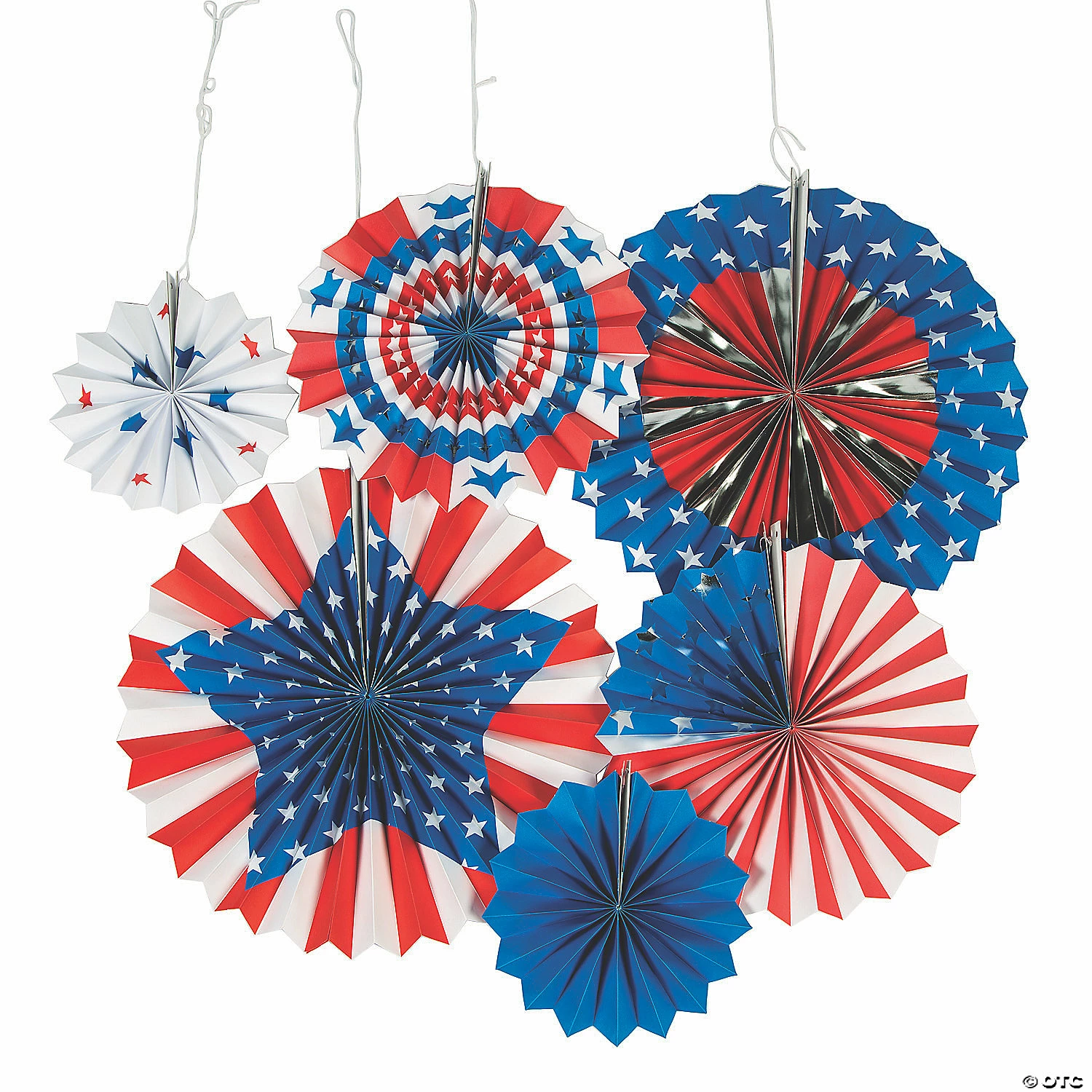 β’ VIBRANT COLORS: Choose the hanging fan color that best matches your patriotic celebrationβs theme for pops of color that will impress guests.β’ QUALITY DECORATIONS: Made from quality materials, these patriotic paper hanging fans only require minimal assembly before theyβre ready for display.β’ BUDGET-FRIENDLY DECORATIONS: You wonβt find these hanging fans at this low price anywhere else! Why spend more on party decorations when you donβt have to?β’ YOUR PARTY SUPPLY HEADQUARTERS: Shop Oriental Trading for unbeatable selection and guaranteed lowest prices. From decorations to tableware to party favors and more, we can help you party for less!Product Description:Decorating an event using actual American flags is considered by some to violate flag etiquette. When you want a patriotic decorative feel, these hanging fans will do the trick without going against U.S. Code, making them perfect decorations for any celebration for the U.S.A.! Great for parades, military gatherings or patriotic celebrations, these fans will add depth to red, white and blue decorations. Size: Includes 2 each 8β, 12 1/2β and 16β diam.Shape: RoundQuantity: 6Material: PaperSimple assembly required.