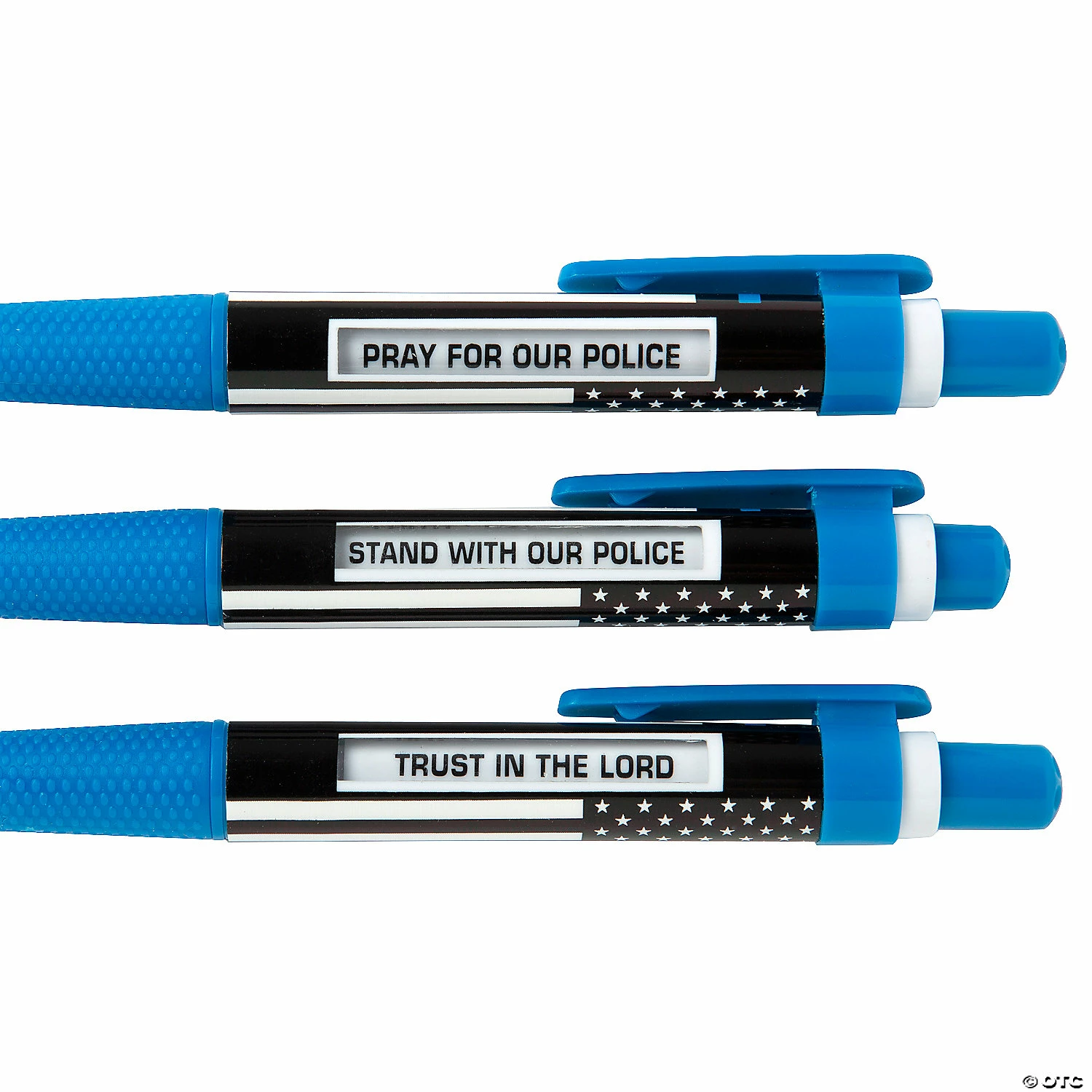 These pens have a big message – actually, they have six messages! Each thin blue line pen has six alternating messages that appear with a click of the pen. “Pray for our police”, “Stand with our police”, “Trust in the Lord” and more are just a few of the faith-filled pro-police sentiments appearing on these pens. Hand these pens out at first responder community celebrations to show support for law enforcement. Plastic. (1 dozen per unit) 5 1/2″ Each pen includes 6 messages. Black ink. © OTC