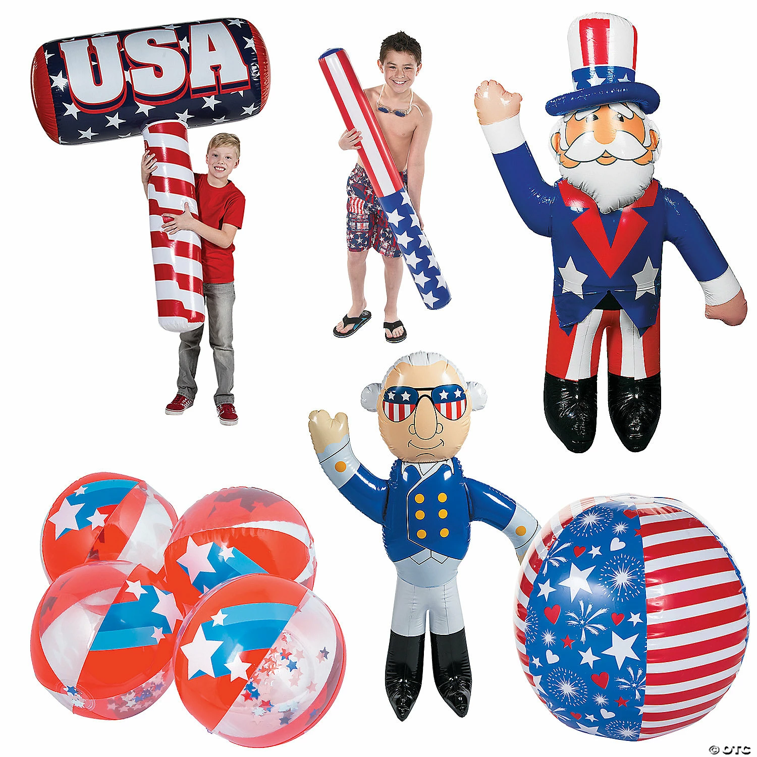 Have some red, white and blue fun with this bundle of patriotic inflatables. Have these on hand at your Fourth of July party or other summer gathering and watch guests grab an inflatable and start playing and laughing β adults or kids! Partygoers canβt resist these fun inflatable toys, especially when the inflatables all feature patriotic colors and themes! (22 pcs. per unit) Assortment may vary.Includes:β’ 6 Vinyl Inflatable Patriotic Pool Noodles (4 ft. x 5″ diam.)β’ 1 Vinyl Inflatable Jumbo Uncle Sam (Inflated, 22″ x 5 ft. 4″)β’ 1 Vinyl Inflatable Patriotic Hammer (Inflated, 39 1/2″ x 60″.)β’ 12 Vinyl Inflatable Patriotic Confetti Beach Balls (Inflated, 11″)β’ 1 Vinyl Inflatable Giant Patriotic Beach Ball (Inflated, 30″ diam.)β’ 1 Vinyl Inflatable Patriotic Hammer (Inflated, 39 1/2″ x 39″ x 60″)β’ Assortments are subject to change at any time and may vary from picture shown. Substituted items will be similar in nature.