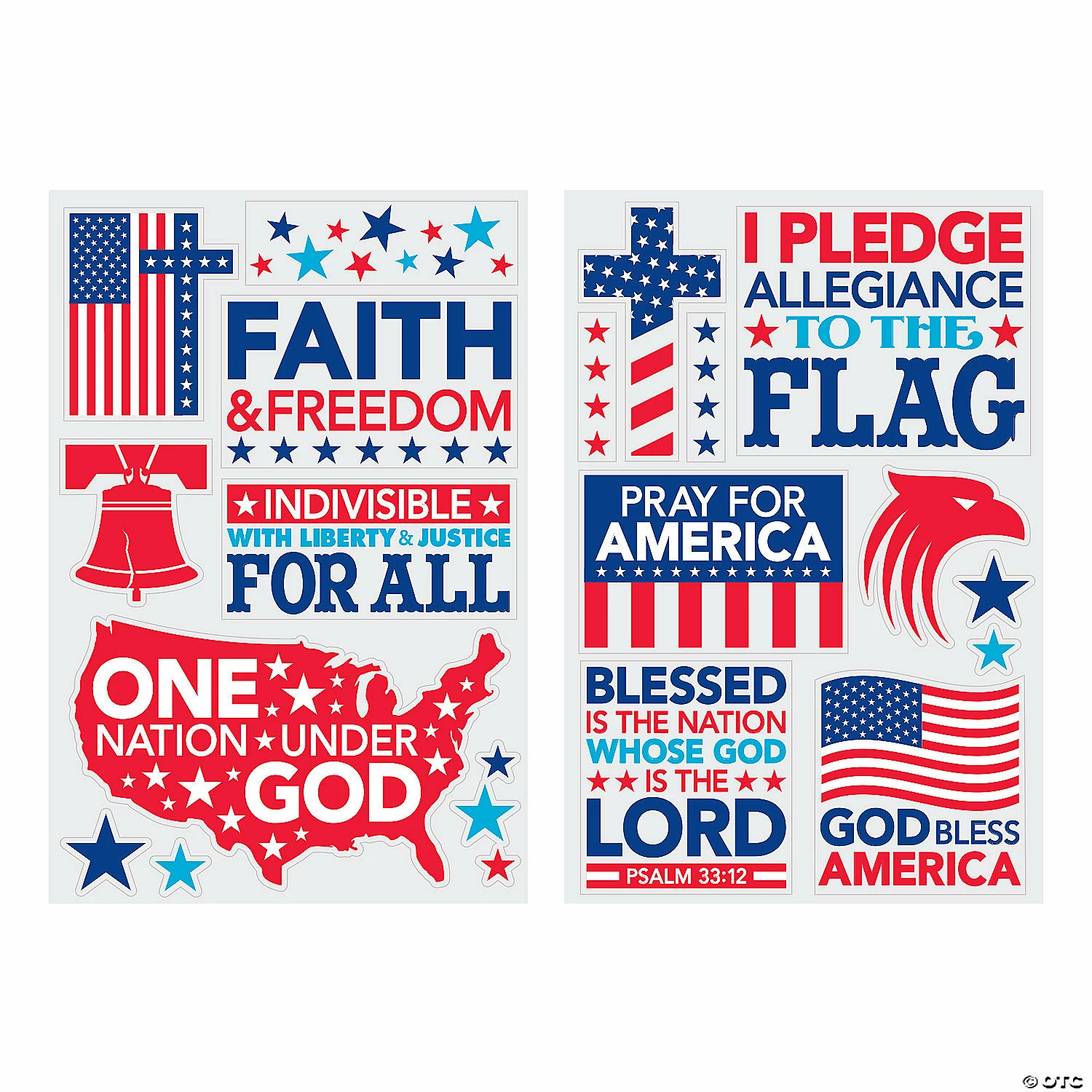 Celebrate God and country with these patriotic window clings! These patriotic clings will stick to windows or any other flat, smooth surface and can be removed and placed again. Featuring plenty of red, white and blue images along with religious themes, these window clings are a perfect religious Fourth of July decoration. Vinyl.ย (2 sheets/set, 19 clings/set) Sheet, 23 1/2″ x 35″. Reusable clings stick to and peel from smooth surfaces easily. ยฉ OTC